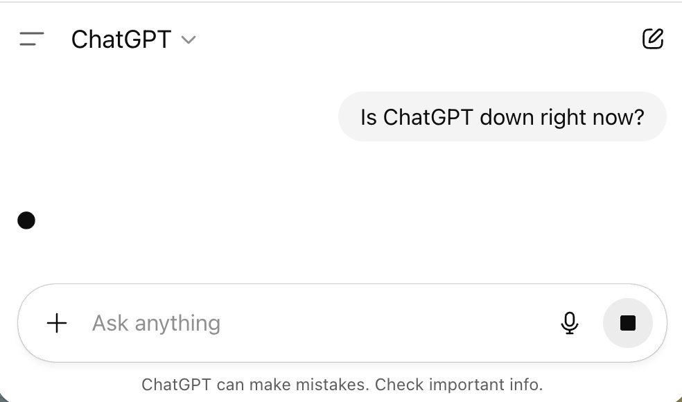 На странице статуса OpenAI сообщается, что команда работает над устранением неполадок. Многие пользователи сообщают о том, что вместо ожидаемых ответов видят лишь черную точку в интерфейсе ChatGPT. По данным Downdetector, тысячи пользователей уже отметили, что сервис недоступен.