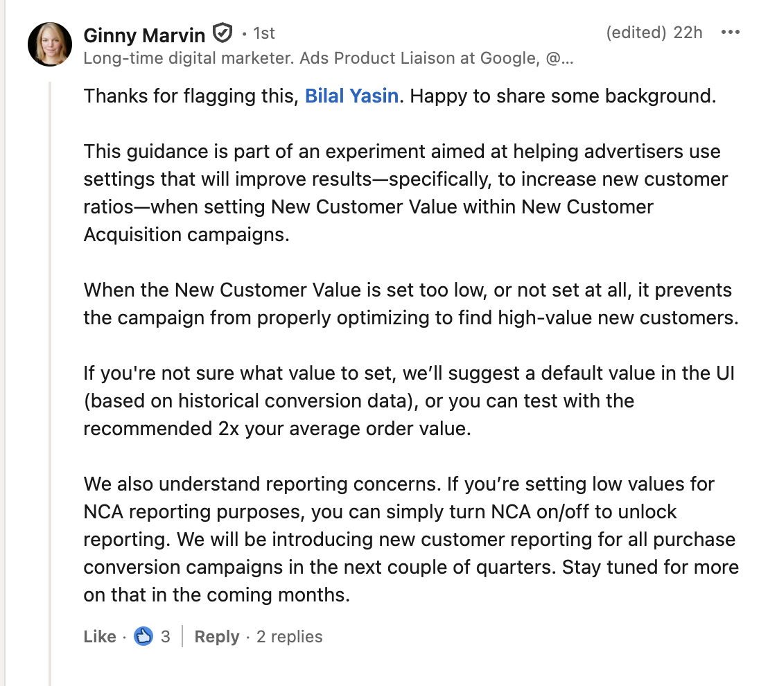 Представитель Google Ads Джинни Марвин подтвердила, что данное поведение является частью эксперимента. Она отметила, что цель этого эксперимента — помочь рекламодателям использовать настройки, которые улучшат результаты, в частности, увеличат долю новых клиентов. Однако, по ее словам, когда «Ценность нового клиента» слишком низка или не установлена, это может затруднить оптимизацию кампаний.