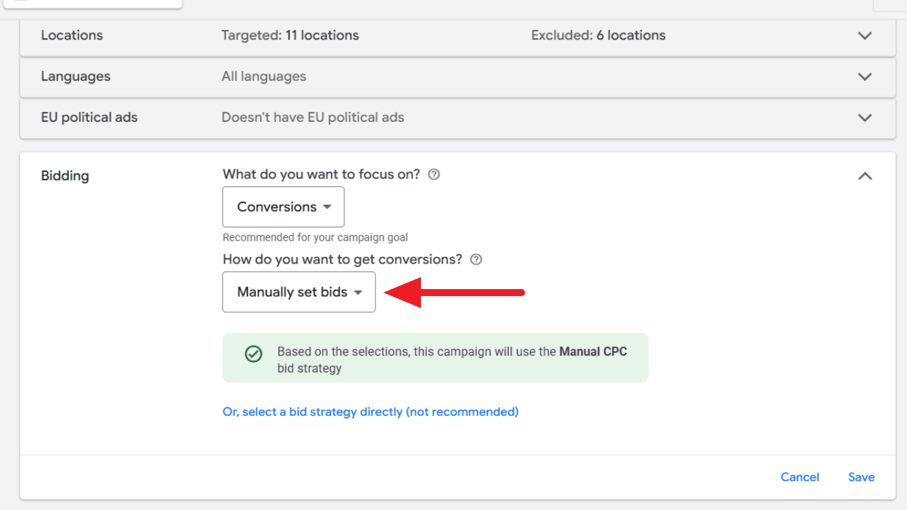Google Ads сделал шаг навстречу рекламодателям, упростив доступ к ручной стратегии CPC во время настройки кампаний. Теперь вместо того, чтобы искать опцию «Выбрать стратегию ставок напрямую (не рекомендуется)», пользователи могут легко выбрать «Установить ставки вручную» прямо под целью «Конверсии».