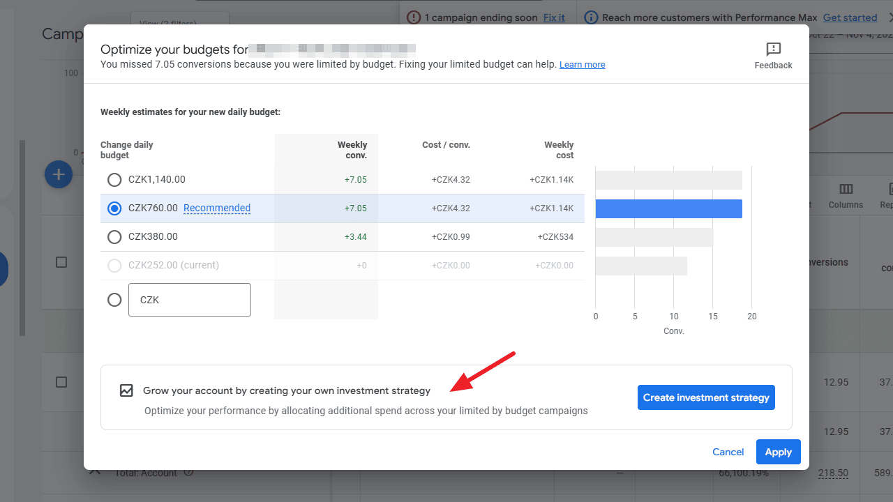 Когда Google обнаруживает, что кампания сталкивается с ограничениями по бюджету, в интерфейсе появляется новое сообщение: «Развивайте свой аккаунт, создавая свою стратегию инвестиций в Google». Рекламодатели могут нажать кнопку «Создать стратегию инвестиций», чтобы смоделировать возможные увеличения бюджета и оценить потенциальные выгоды в виде конверсий, ценности или кликов.
