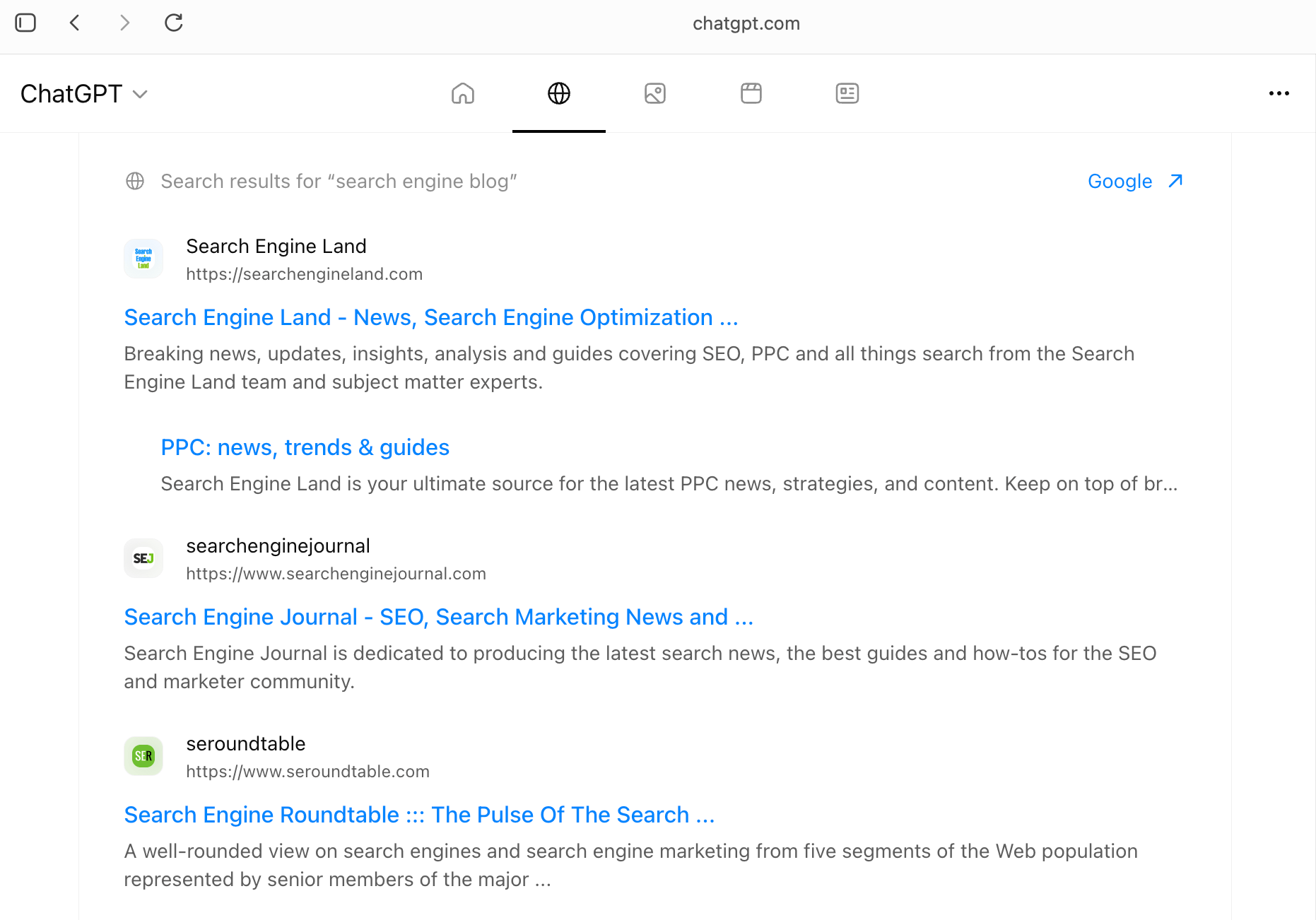 При поиске в Atlas пользователи получают результаты, похожие на те, что предоставляет ChatGPT, но с добавлением вертикальных вкладок для различных типов контента: веб-страницы, изображения, видео и новости. При этом вверху каждой группы результатов есть ссылка на Google, что подчеркивает сотрудничество OpenAI с этой поисковой системой.